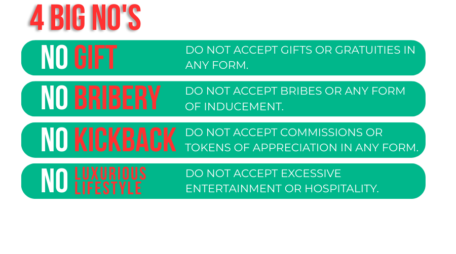 OPAC Group have implemented an Anti-Bribery Management System (ABMS) in accordance with ISO 37001:2016. We are fully committed to upholding the 4 Big No’s as part of our continuous effort to promote integrity, transparency, and ethical business conduct.